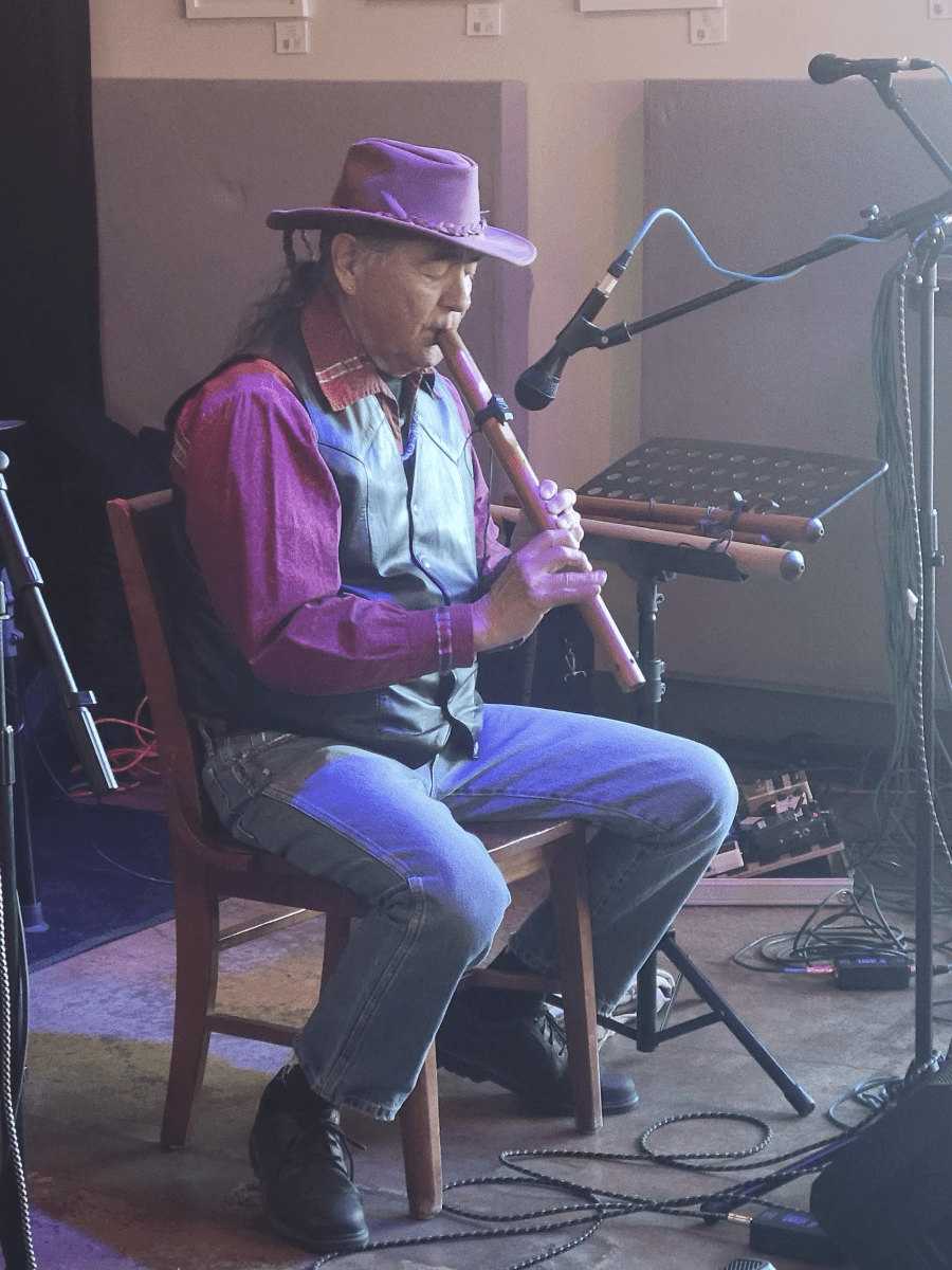 Dennis started playing the Native American flute about thirty years ago. With no formal training, he just grabbed a Native American Flute and began playing. Dennis now has an array of four favorite flutes he likes to play. He plays from the heart in an improvisational style, whatever he’s feeling at the time. During the pandemic, he often played for the neighbors on his front porch and has continued that tradition.